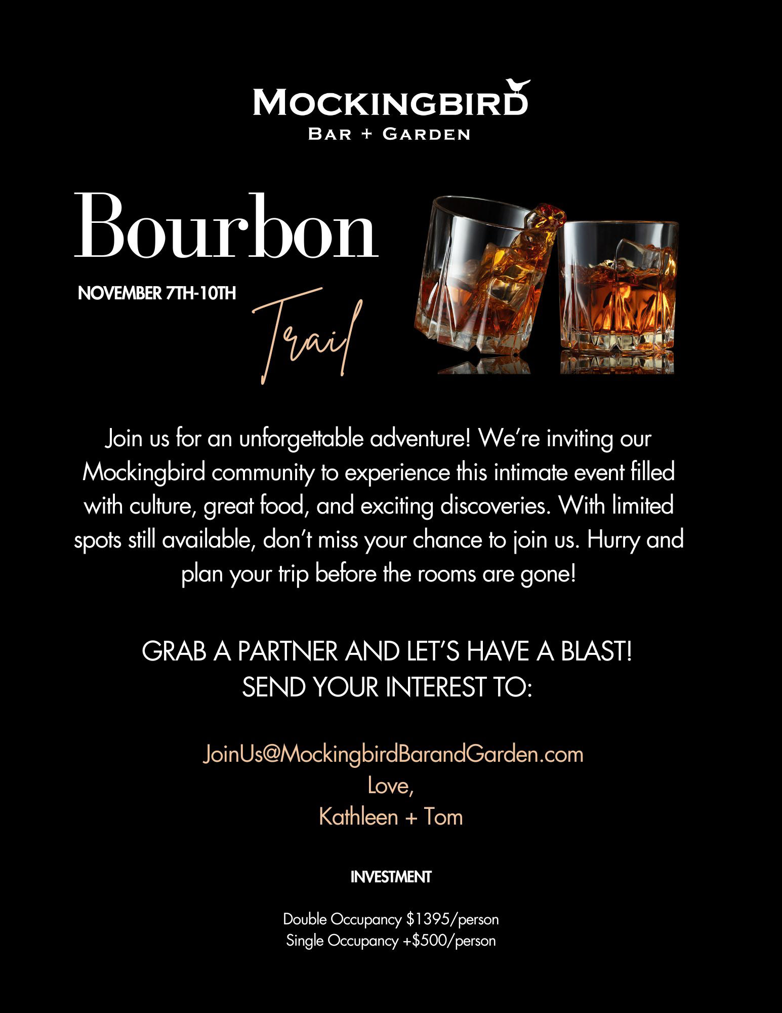 At Mockingbird Bar + Garden, I executed a complete website rebrand and currently design and distribute their monthly newsletter and promotional materials for events. Below are just a few examples of the digital assets I've created while I've been been working with them.